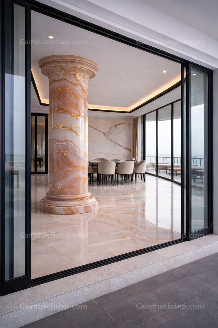 Giả đá cẩm thạch cao cấp hồng ngọc được hoàn thiện bằng kỹ thuật vẽ giả đá tinh xảo, tạo nên một trụ tròn sang trọng với hiệu ứng vân đá tự nhiên mềm mại uốn lượn xuyên suốt thân trụ. Các lớp màu hồng – kem – trắng hòa quyện tạo chiều sâu ấn tượng, kết hợp cùng các đường vân vàng ánh kim lấp lánh như dòng chảy kim loại quý, mang đến cảm giác đẳng cấp và quyền lực cho không gian.