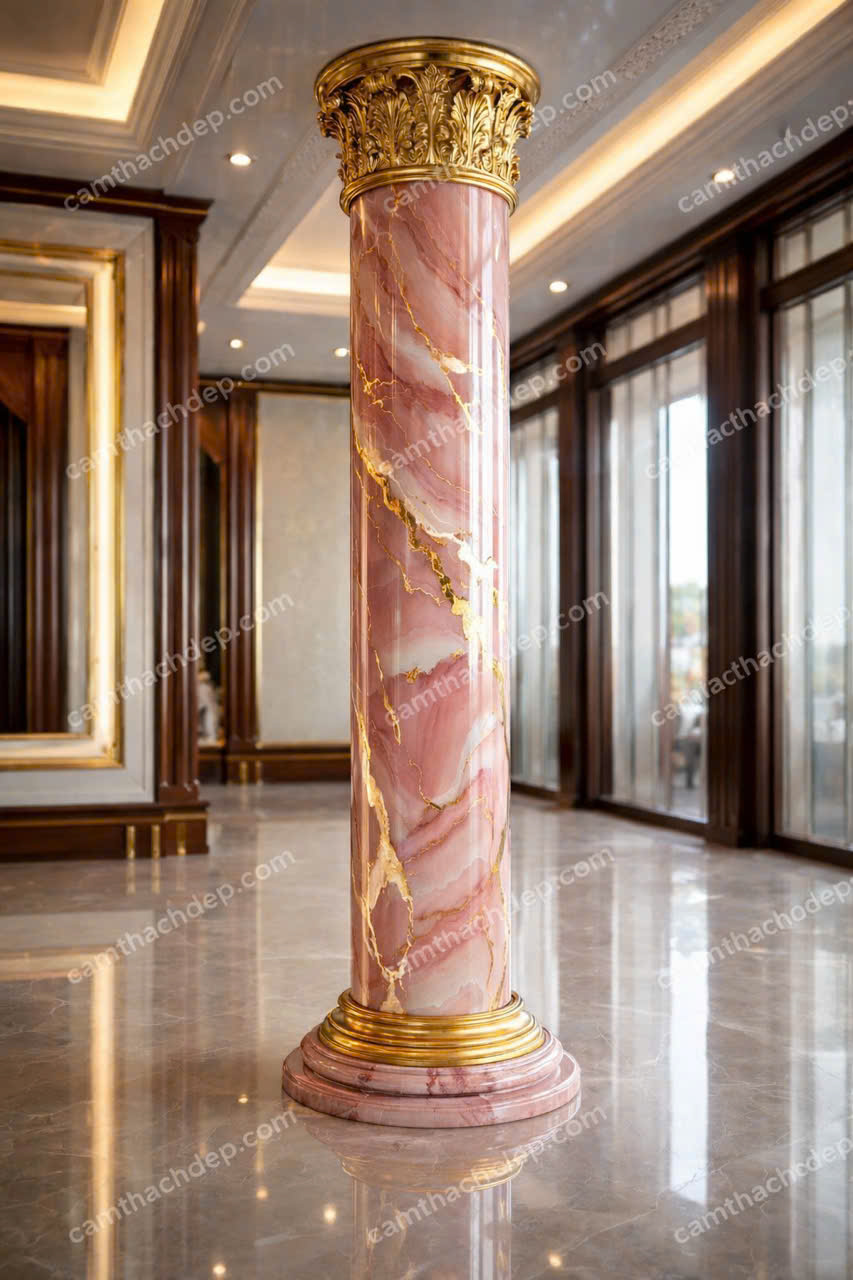 Tông màu hồng ngọc pha trắng kem kết hợp cùng các đường vân vàng ánh kim tạo nên chiều sâu thị giác ấn tượng, vừa nhẹ nhàng vừa quyền quý. Phào đầu và đế trụ được thiết kế đồng bộ với sắc vàng sang trọng, giúp tổng thể trụ trở thành một khối liền mạch, nổi bật giữa không gian nội thất cao cấp.