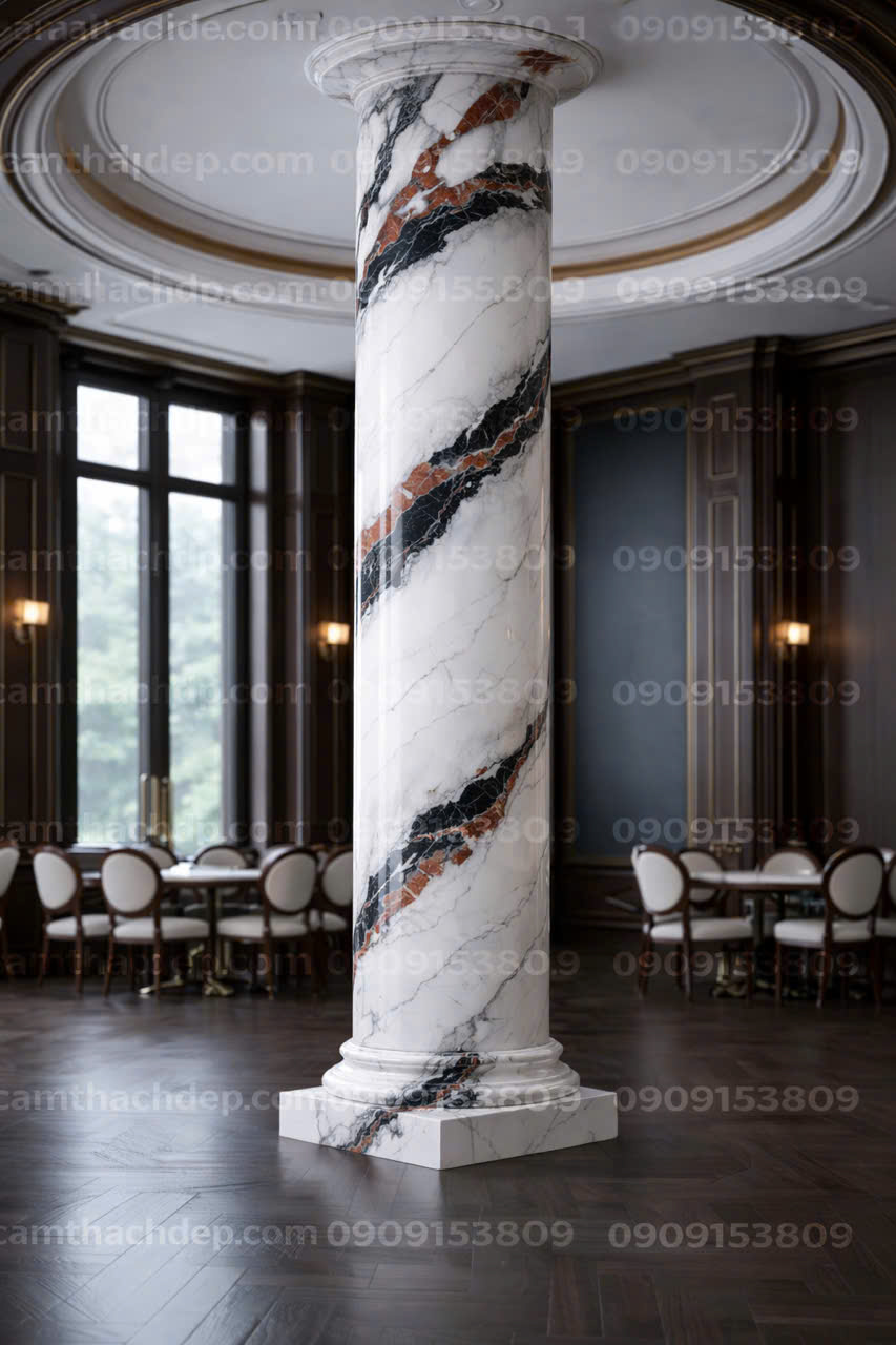 Giả đá cẩm thạch cao cấp trắng vân đen đỏ được hoàn thiện bằng kỹ thuật vẽ nghệ thuật siêu thực, mang đến một trụ đá sang trọng với bề mặt bóng kính cao cấp, phản chiếu ánh sáng như gương ✨