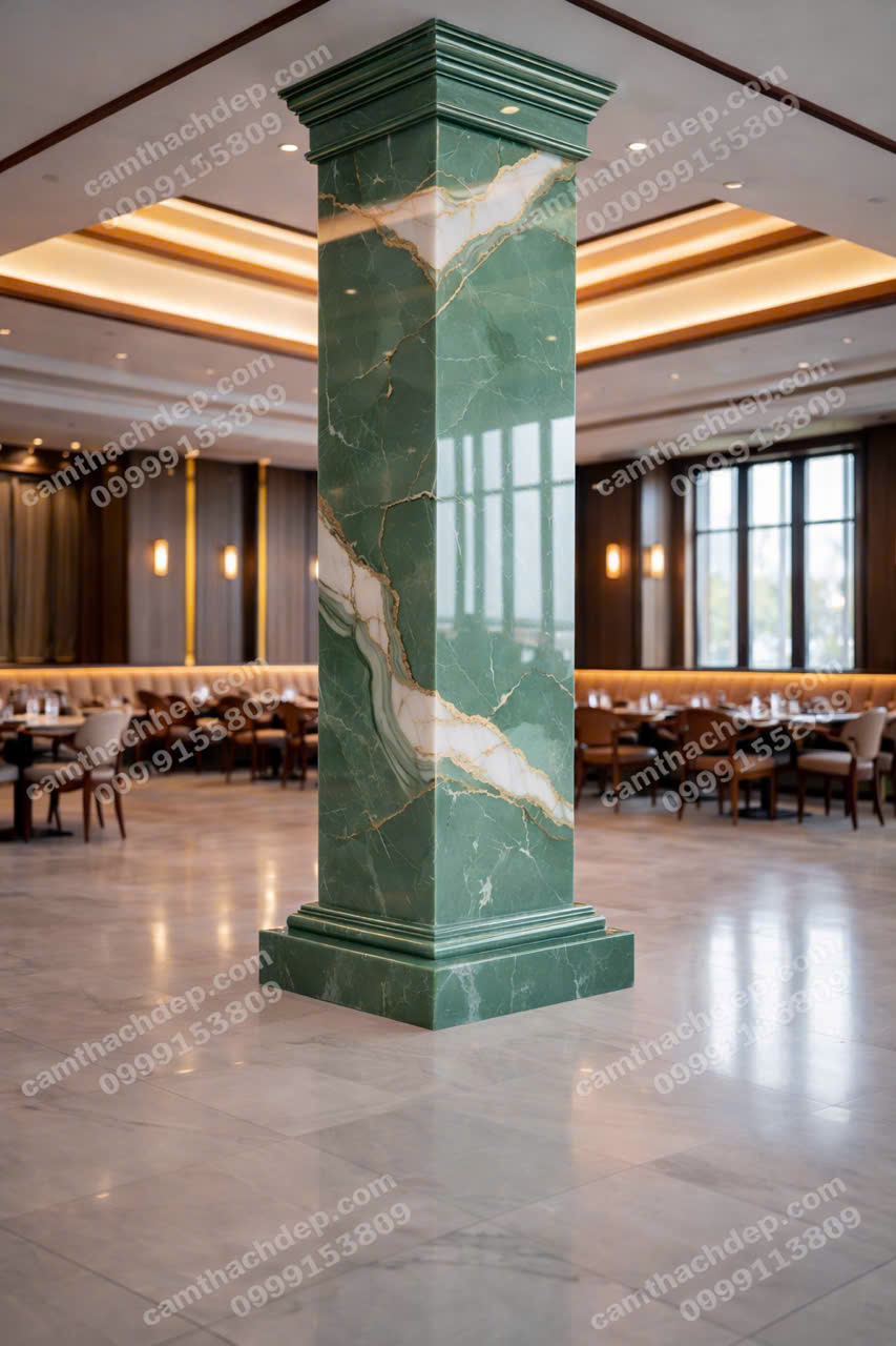 Giả đá cẩm thạch cao cấp xanh ngọc được hoàn thiện bằng kỹ thuật thi công tinh xảo, tạo nên một trụ cột sang trọng với độ bóng gương vượt trội, phản chiếu ánh sáng rõ nét như mặt kính. Các đường vân trắng tự nhiên kết hợp cùng vân vàng ánh kim chạy uốn lượn mềm mại quanh thân trụ, mang lại cảm giác dòng chảy nghệ thuật sống động và đẳng cấp.